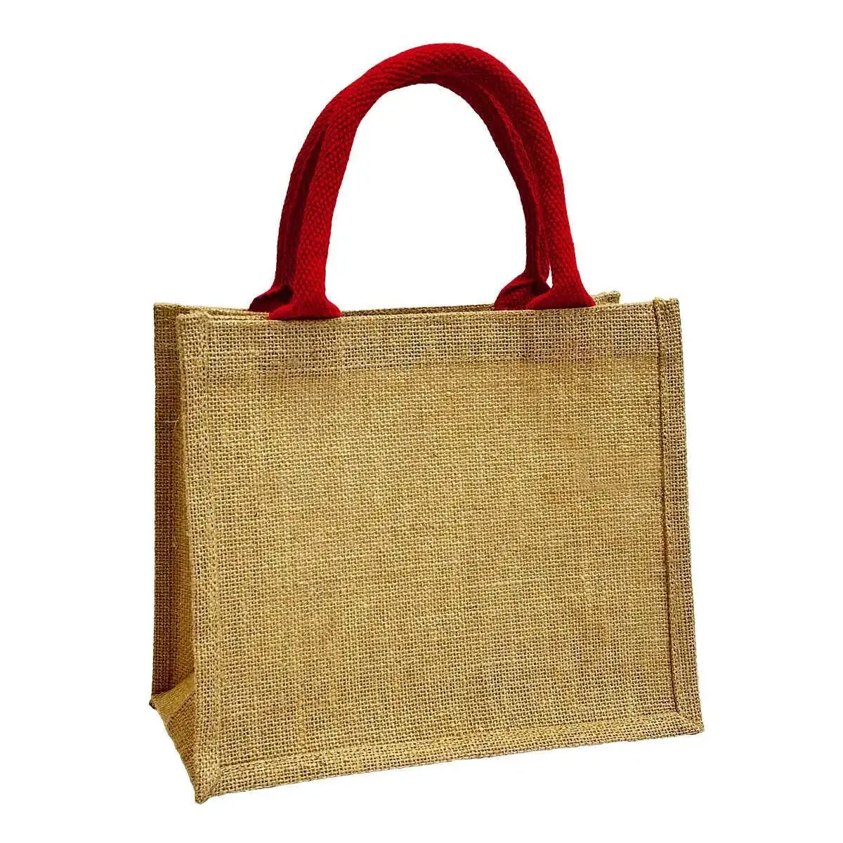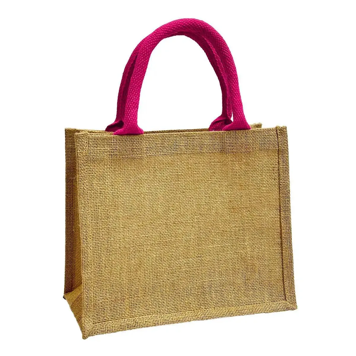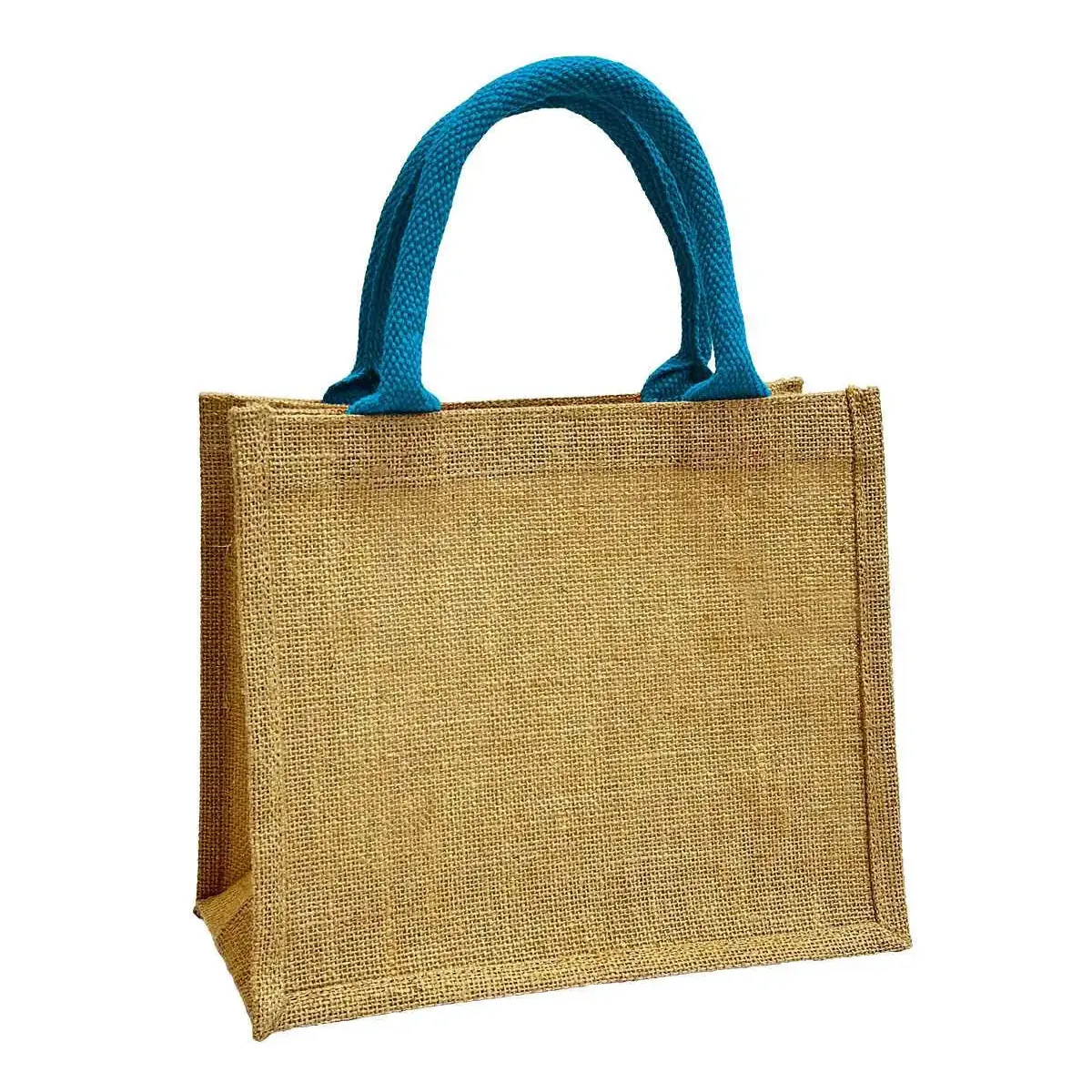 Mała torebka jutowa na lunch lub prezentowa Wykonana ze wzmacnianej juty w naturalnym kolorze. Kolorowe bawełniane krótkie uchwyty do noszenia w ręce w 11 kolorach.