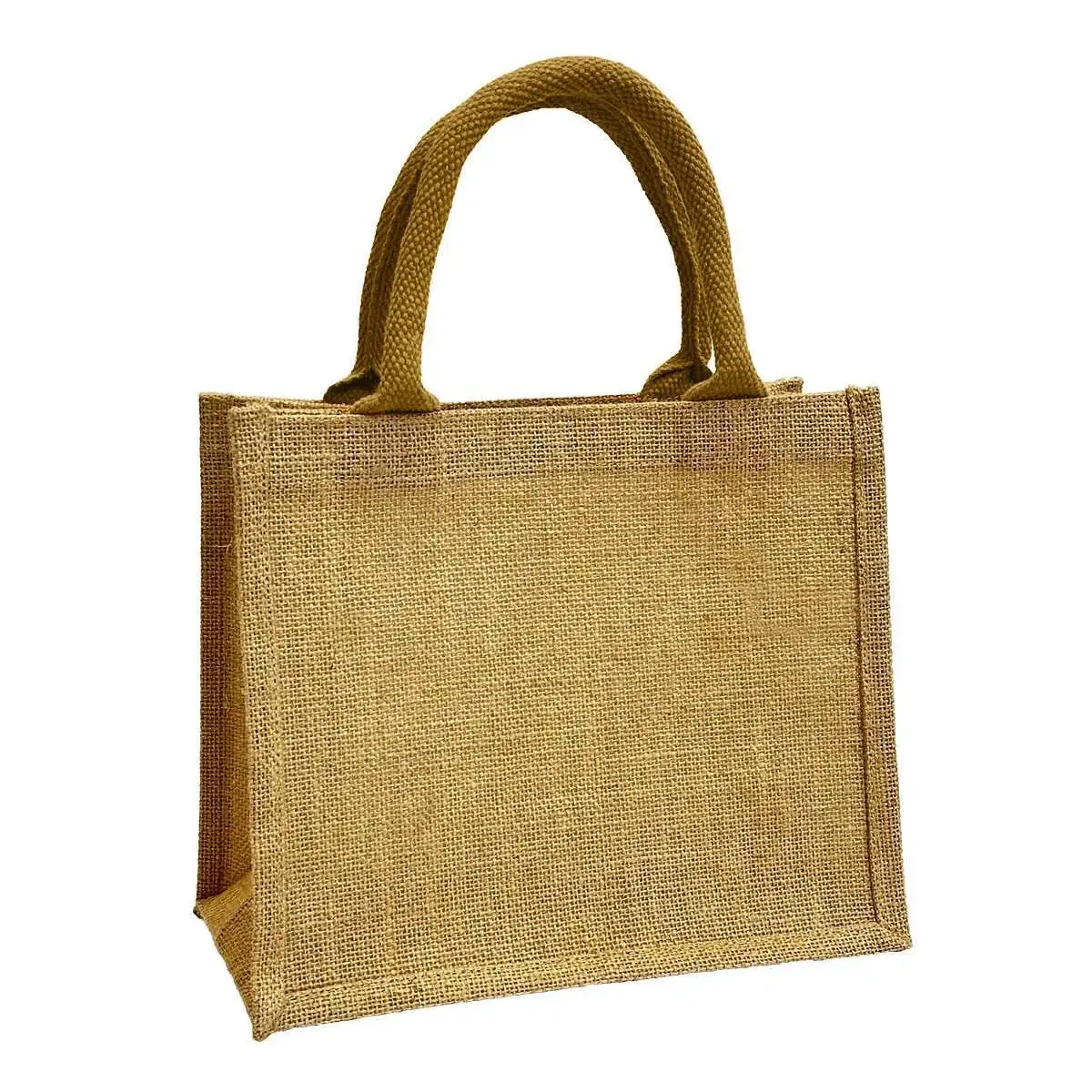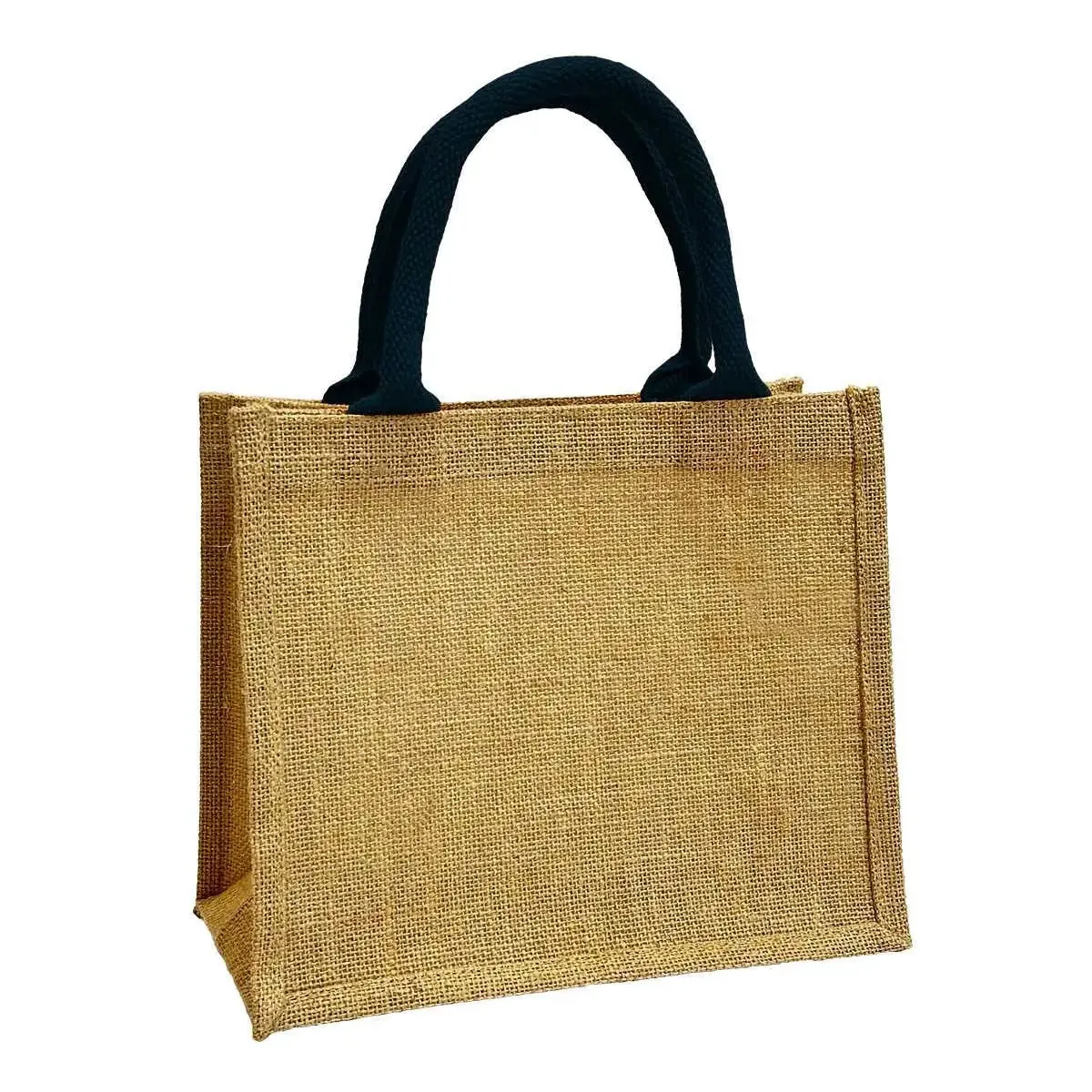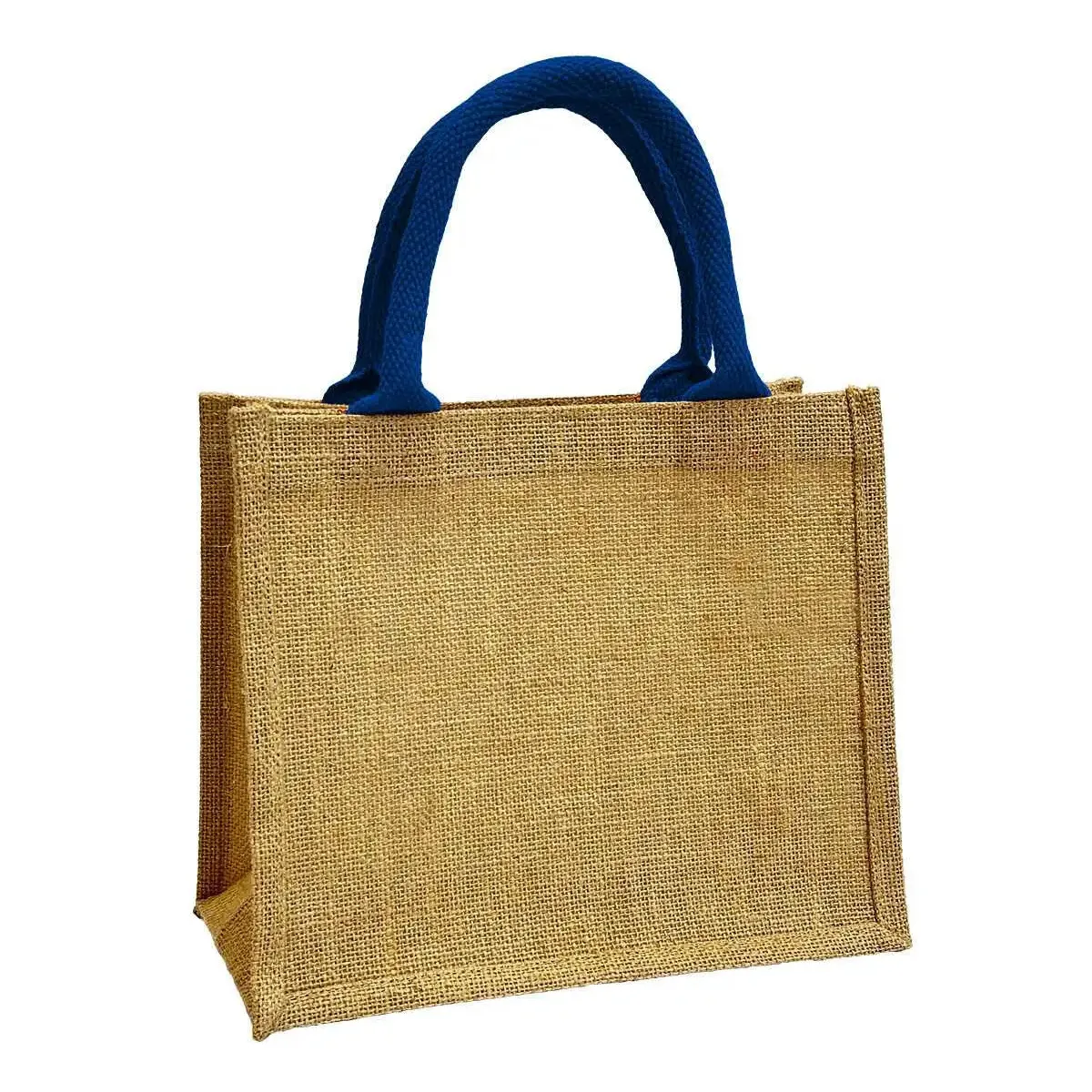 Mała torebka jutowa na lunch lub prezentowa Wykonana ze wzmacnianej juty w naturalnym kolorze. Kolorowe bawełniane krótkie uchwyty do noszenia w ręce w 11 kolorach.